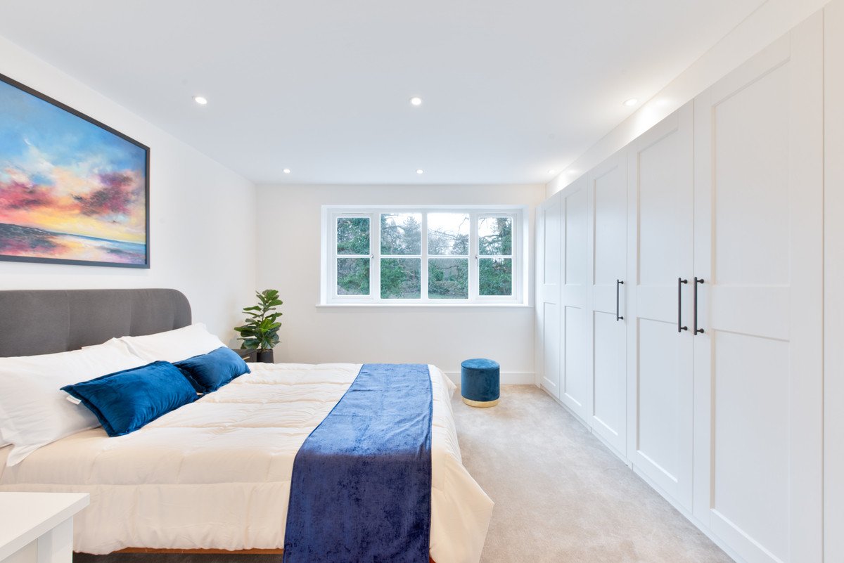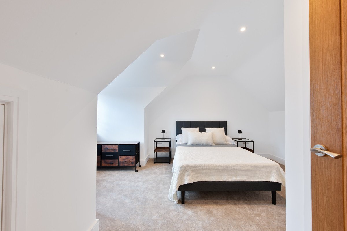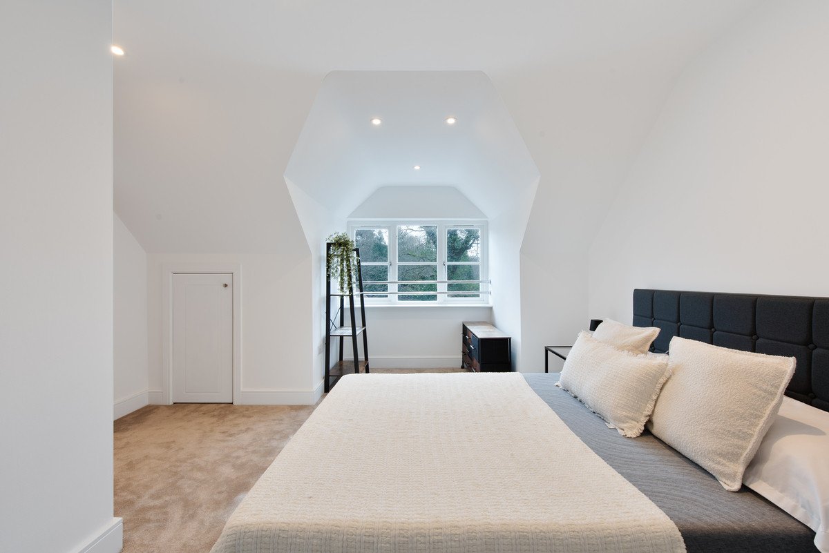The suite is complemented by a private bathroom and an incredible amount of walk-in eaves storage, providing a practical solution for a clutter-free living environment. Whether used as a luxury principal bedroom or a sophisticated guest floor, this space offers a rare level of quietude and independence.