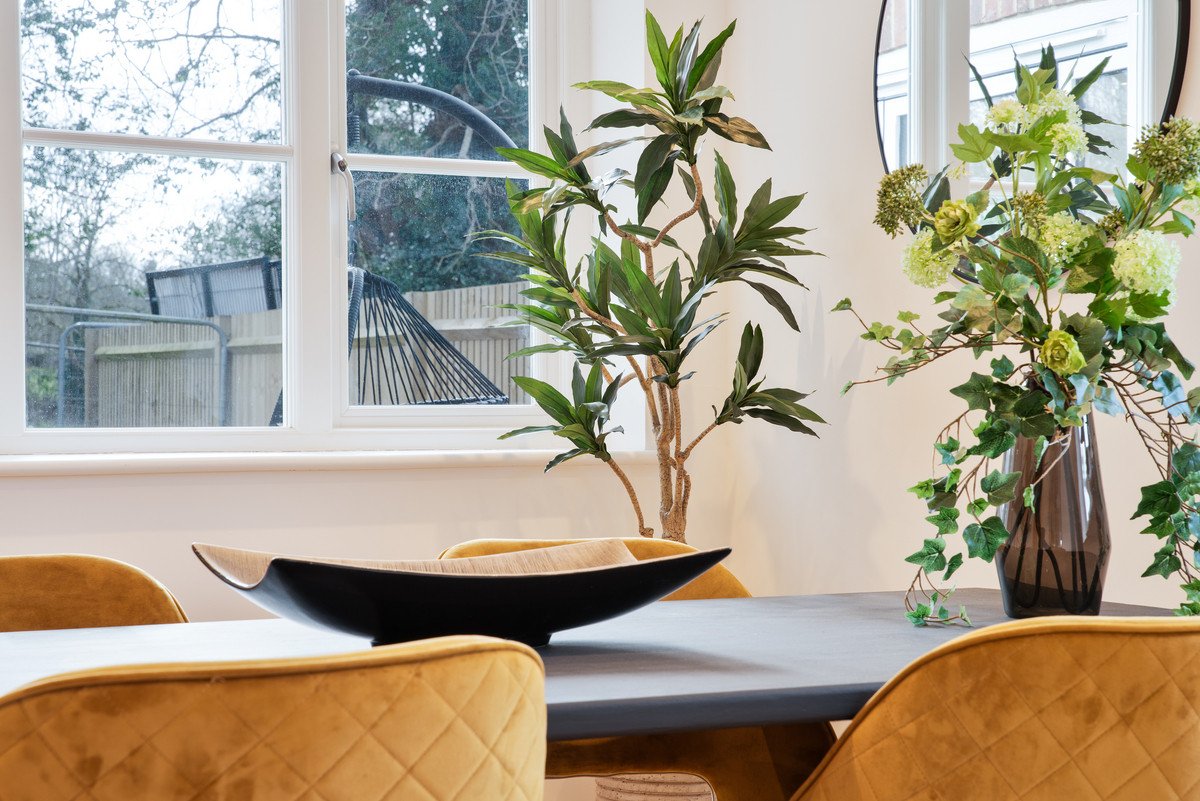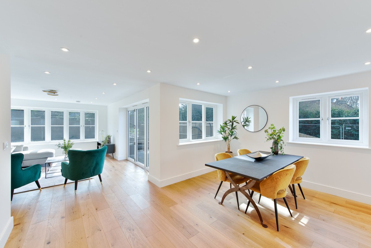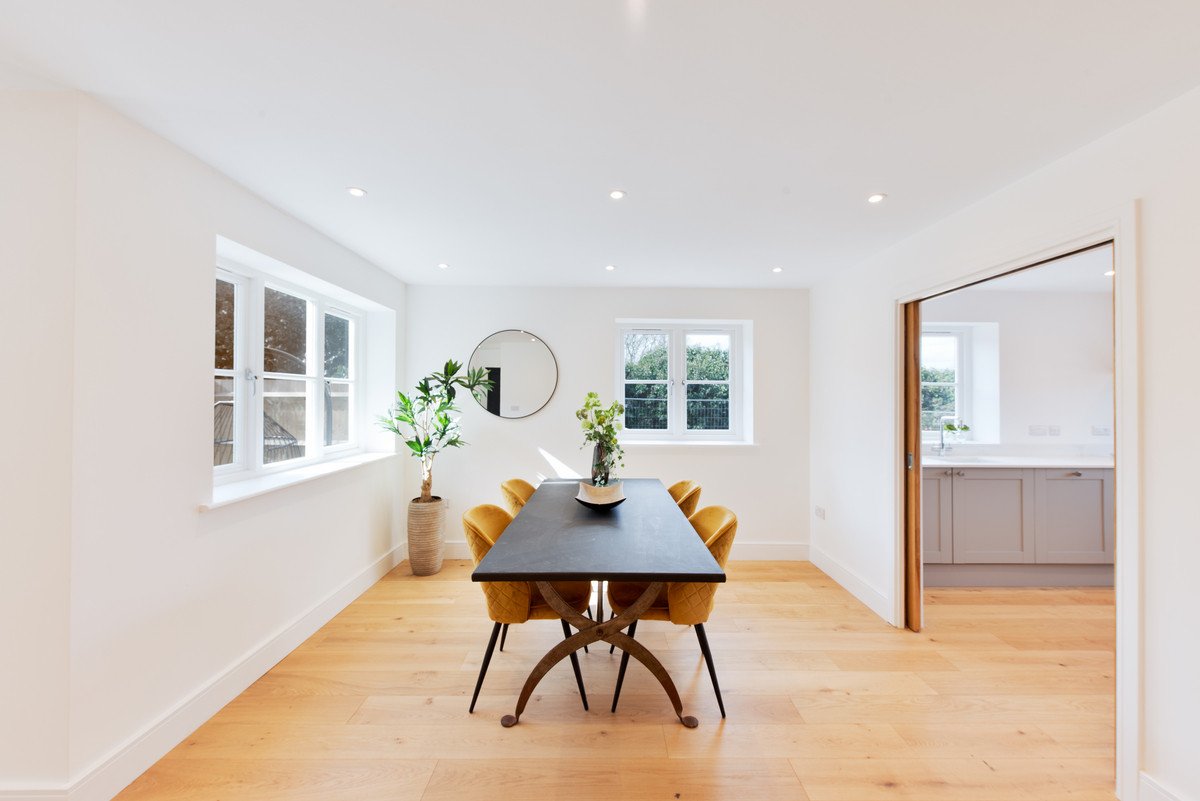 The ground floor is a masterclass in modern social flow, anchored by engineered oak flooring that runs consistently throughout the entire level. At the heartbeat of the home is the thoughtfully-proportioned Shaker-style kitchen, where a U-shaped design and expansive worktops create a seamless transition into the central dining area. This layout offers a deep, social vista that flows directly into the 16ft sitting room, allowing natural light to travel across the open-plan spaces.